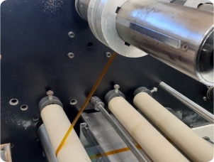 さまざまな特性を持つテープをローラーで圧着しながら貼り合わせます。