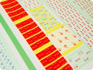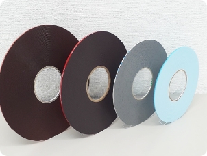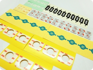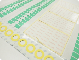 片面、両面、金属箔テープから機能性のある素材まで、お客様のご要望を打抜き加工で「形」にします。ただ形にするだけではなく、お客様の使用用途に合わせ作業性まで考慮し、よりニーズに合った製品をご提案します。穴付形状、タブ付形状、額縁テープ、治具貼り用テープなど複雑な形状もご相談ください。